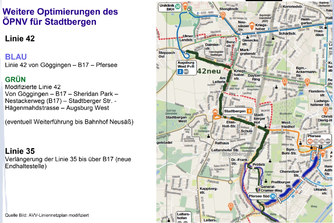 “Die Stadt Stadtbergen soll sich aktiv für einen deutlich besseren ÖPNV nach/von Stadtbergen beim Landratsamt Augsburg und dem AVV einsetzten. Insbesondere soll sich die Stadt Stadtbergen dafür einsetzen, ein Schnellbusnetz im AVV / Ballungsraum Augsburg bis 2026 zu etablieren. Als Vorlage könnte das Mobilitätskonzept “Verkehr 4.0 für den Ballungsraum Augsburg” (www.Verkehr4x0.de) dafür herangezogen werden.