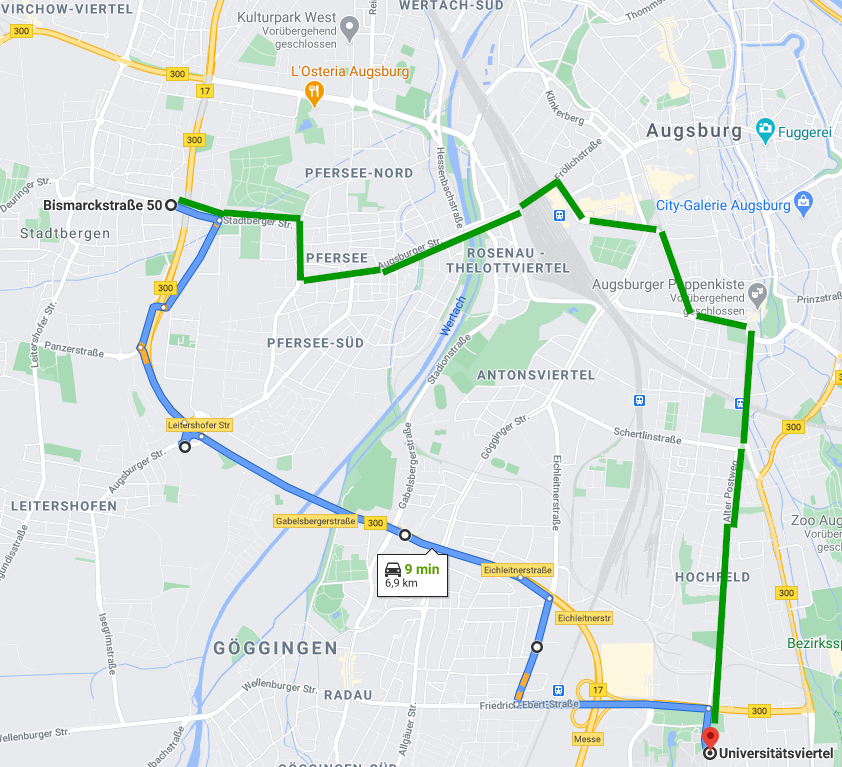 Die Streckenführung mit dem Schnellbus (in blau auf B17) und der heutigen Strecke der 3-er Straßenbahnlinie (grün) über den Königsplatz ist im folgenden Bild dargestellt. Hier wird deutlich ersichtlich, dass der Schnellbus auf der B17 eine deutlich vorteilhaftere Strecke an die Universität von Augsburg hat.