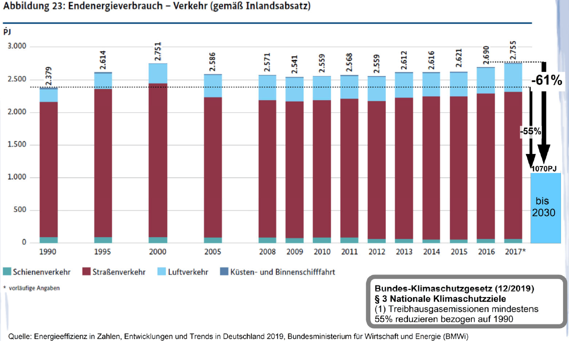 Wie in der obigen Graphik zu sehen ist, muss der Energiebedarf des Verkehrssketors um mindestens 61% des Wertes von 2017 gesenkt werden.